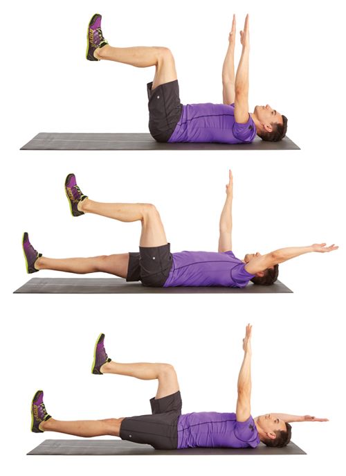 - Lie face up with your arms extended toward the ceiling and your legs in a tabletop position (knees bent 90 degrees and stacked over your hips). This is starting position.